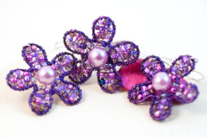 vijolični uhani in prstan ‘rožice’ iz žice in perlic