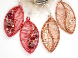 Rdeči in bakreni uhani iz žice in perlic – ‘listi’