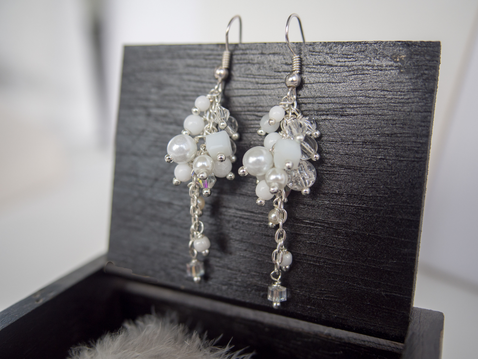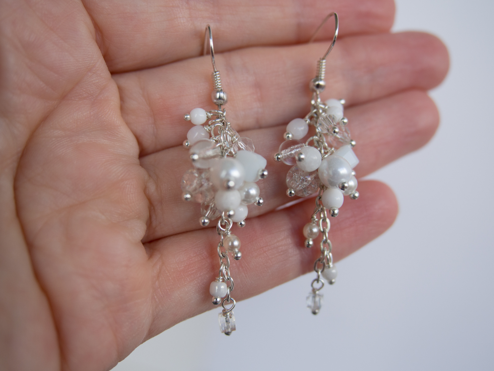 Uhani so ročno izdelani z različnimi belimi perlicami, natančno pritrjenih na osnovo iz srebrne žice. So zelo lahki in udobni za nošenje. Primerni so za vse letne čase in priložnosti saj dodajo svežino in eleganco vsakemu outfitu.