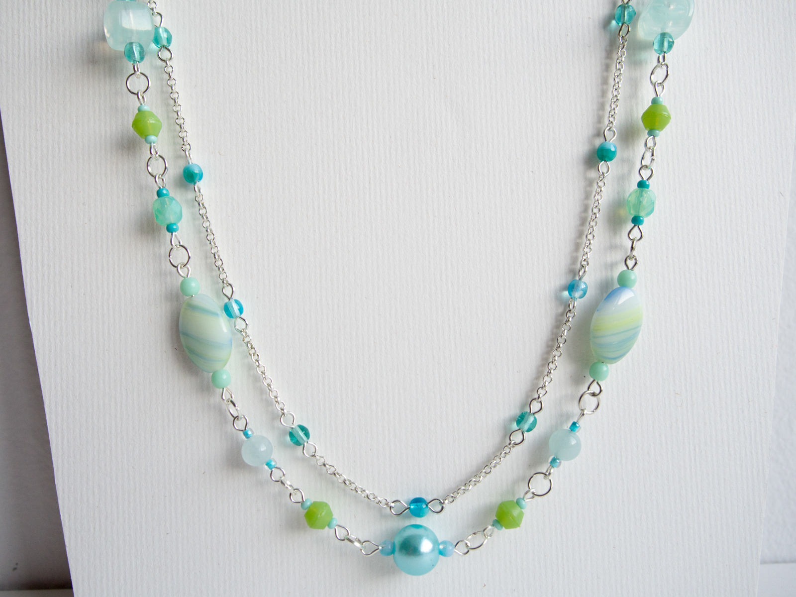 Dodajte svojemu videzu pridih svežine in elegance s to čudovito dvoplastno ogrlico v nežnih turkiznih in vodeno modrih tonih. Prefinjena kombinacija manjših steklenih perlic, večjih Preciosa čeških perl in srebrno obarvane verižice ustvarja moderen, a hkrati brezčasen videz za poslovne priložnosti, sproščena druženja ali večerne izhode.