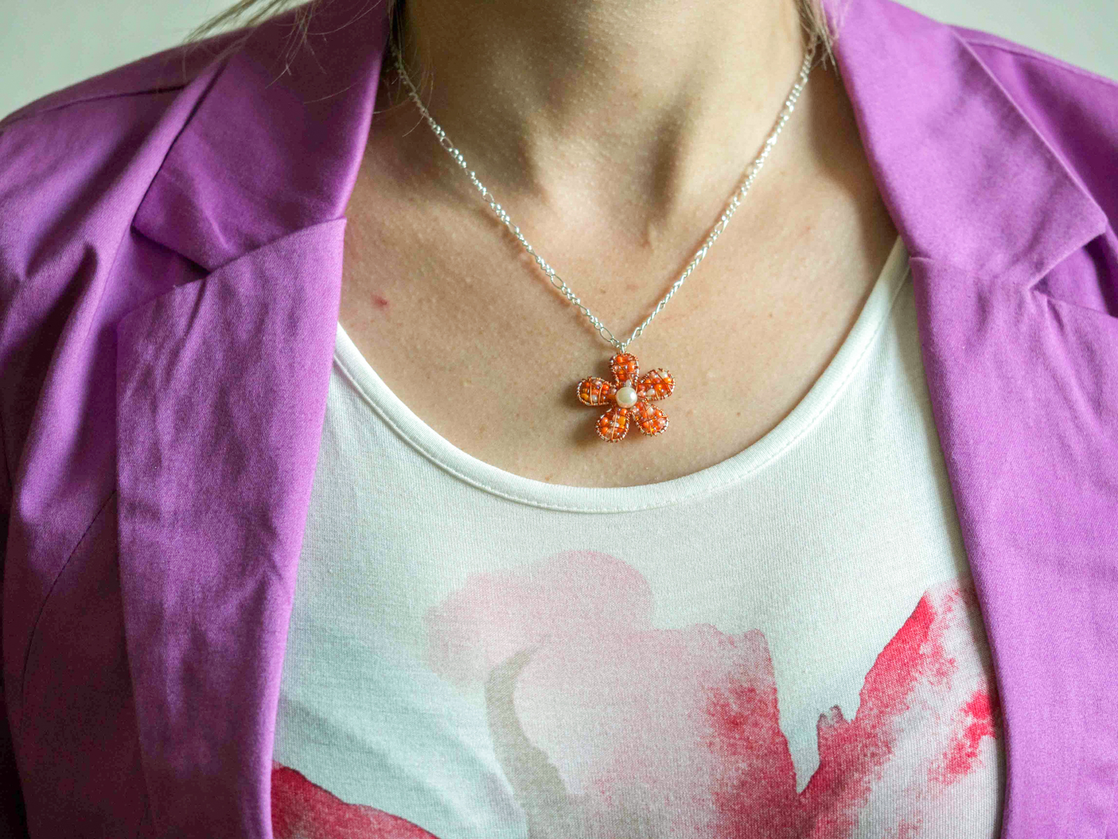 Zapestnica in ogrlica sta izdelani natančno in z ljubeznijo. Osnovo predstavlja oranžna žica na katero so nato nanizane male oranžne perlice ki tvorijo obliko rožice. V sredici rožice in njenih cvetovih je dodanih nekaj krem perlic ki popestrijo barvno shemo.