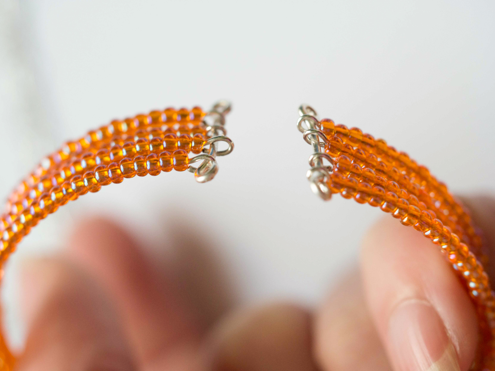 * osnova za zapestnico je izdelana iz spominske žice (ki obdrži obliko, zato ni potrebno zapenjanje) in dekorirana z malimi oranžnimi perlicami
