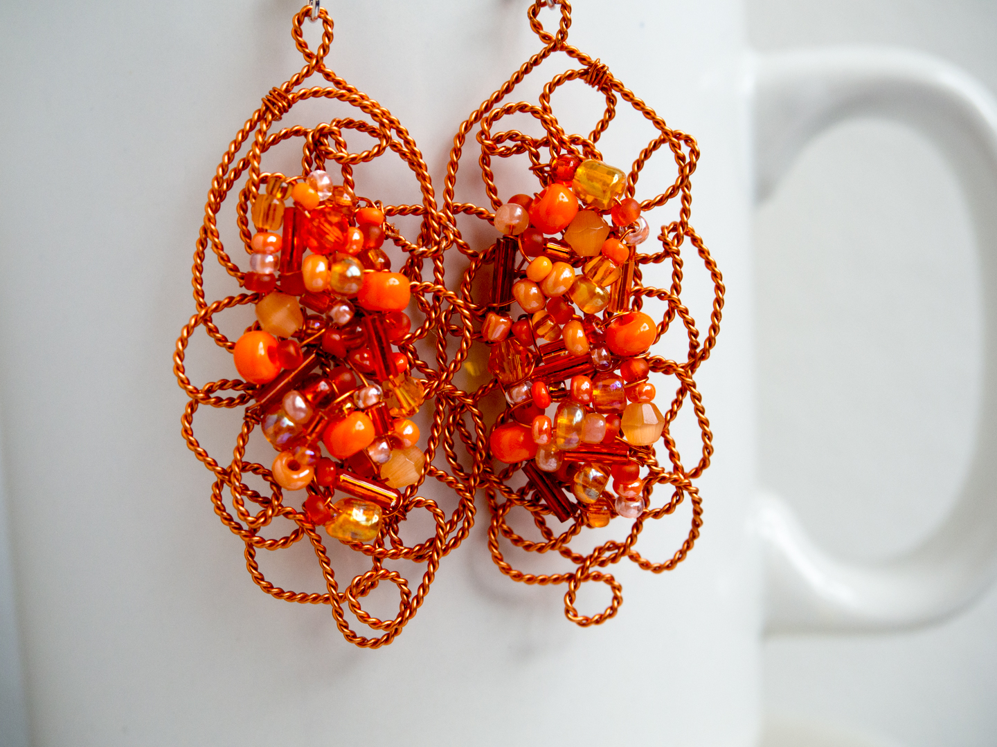 Ti očarljivi uhani za različne priložnosti so izdelani iz navite in zvite oranžne bakrene žice, sredina uhanov pa je dekorirana s perlicami v oranžnih odtenkih. Možna je izdelava tudi v nekaj drugih barvnih odtenkih (povprašajte). Pri izdelavi velik poudarek namenjam natančnemu ovijanju žice tako da se nikamor ne zatika. Prejeli boste uhane iz fotografij.