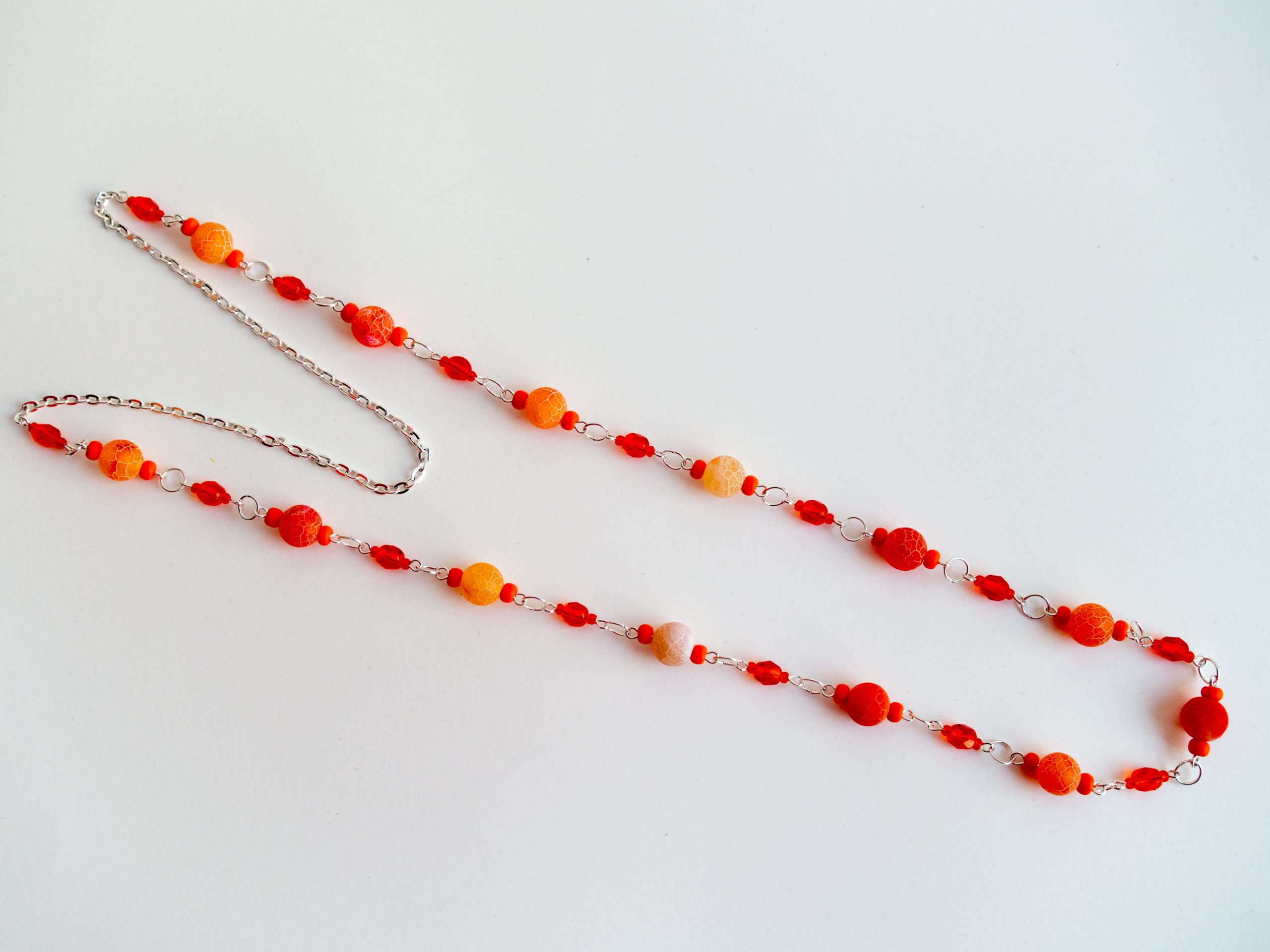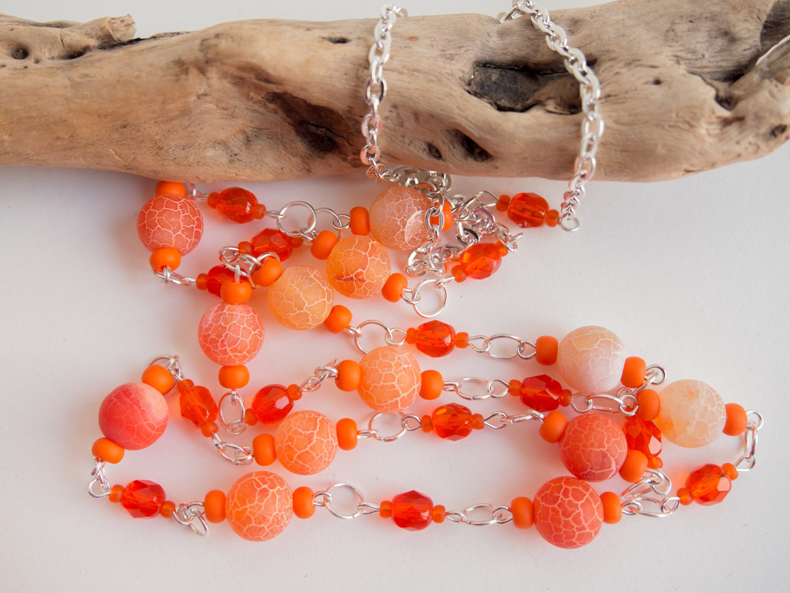 Ogrlica je ročno izdelana iz naravnih agate perl z značilnim razpokanim vzorcem ter dopolnjena z manjšimi oranžnimi perlicami in nežnimi kovinskimi členi. Harmonična kombinacija toplih tonov ustvarja edinstven kos, ki pritegne pozornost brez pretirane teže.