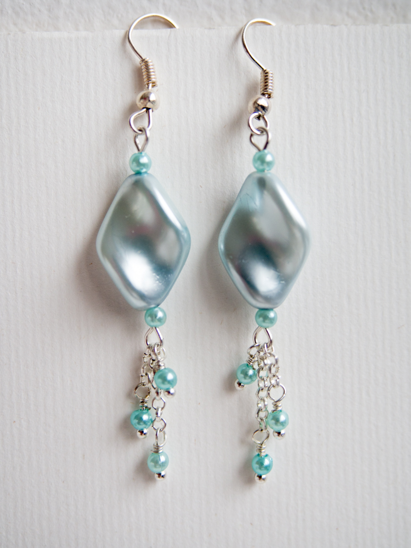 Ta ročno izdelan kos nakita združuje sijaj večjih svetlo modrih steklenih perlic in subtilnost manjših perlic, ki visijo na elegantnih verižicah. Idealni so za posebne priložnosti ali kot vsakodnevni modni dodatek, ki bo osvežil vaš videz. Uhani so precej lahki.