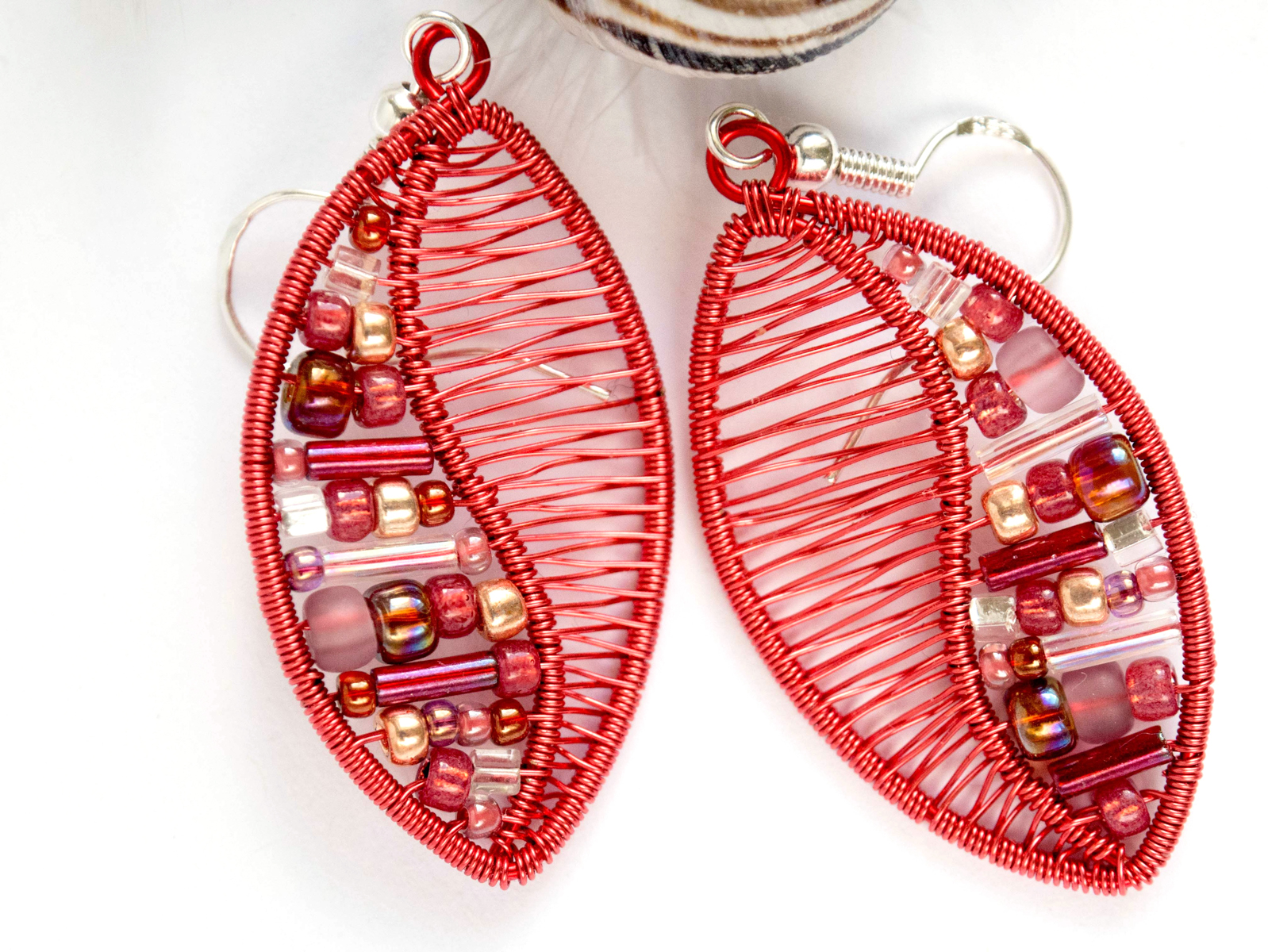 Motiv teh zanimivih uhanov je list. Uhani so narejeni iz rdeče/bakrene barve žice, v katero so vpletene različne perlice v rdečih/bakrenih barvnih odtenkih, saj na način lahko nakit še lažje kombinirate z vašimi oblačili. Pri sami izdelavi uhanov velik poudarek namenjam natančnemu ovijanju žice tako da se nikamor ne zatika. Nakit je udoben in lahek za nošenje.