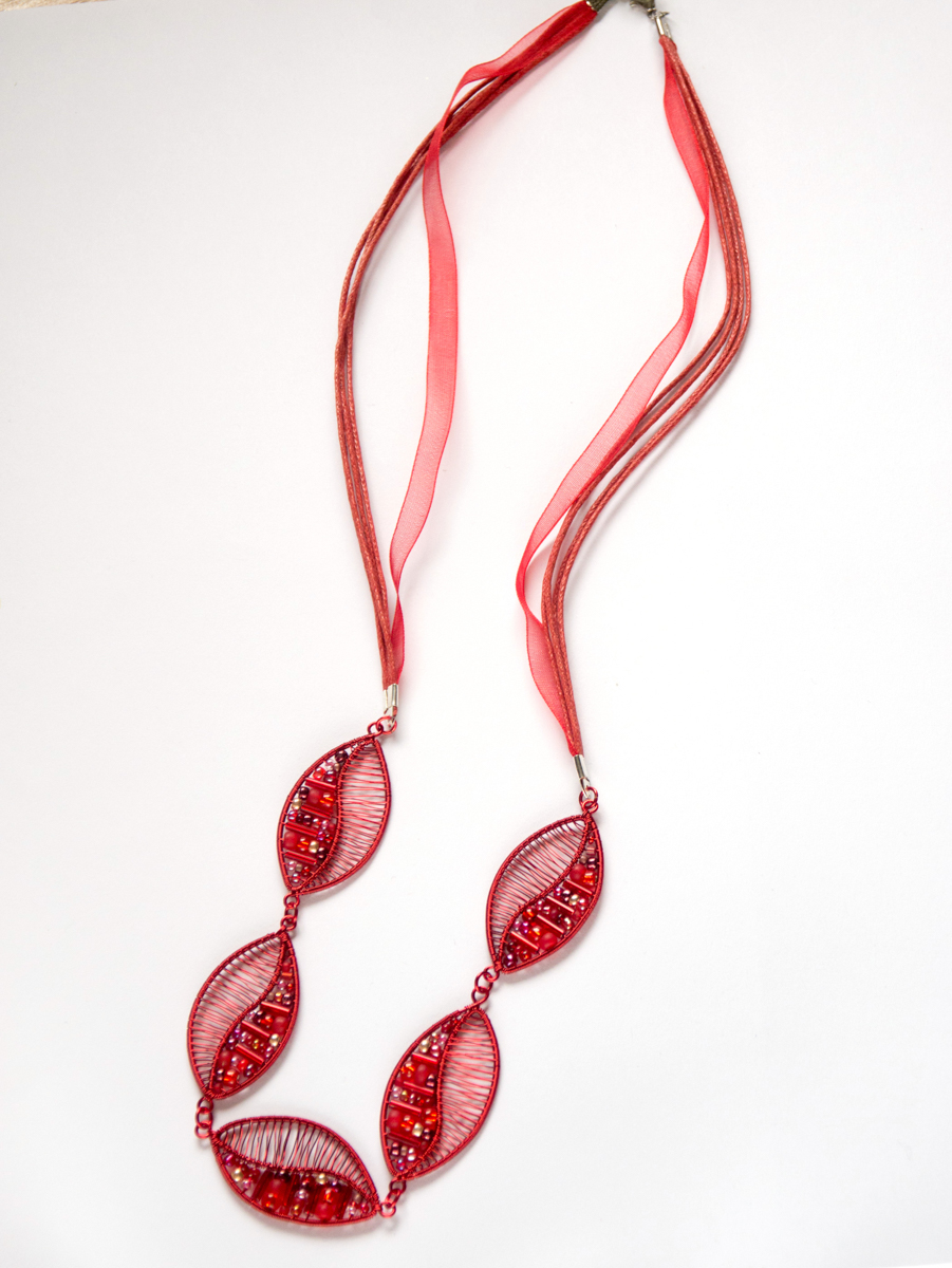 Del ogrlice ki prestavlja liste, je izdelan iz rdeče barvne bakrene žice in različnih odtenkov rdeče barve, kar naredi ogrlico še enostavnejšo za kombiniranje z vašimi oblačili. Pri sami izdelavi velik poudarek posvečam natančnemu ovijanju žice zato da se le-ta nikamor ne zatika. Nakit je udoben za nošenje in dokaj lahek.