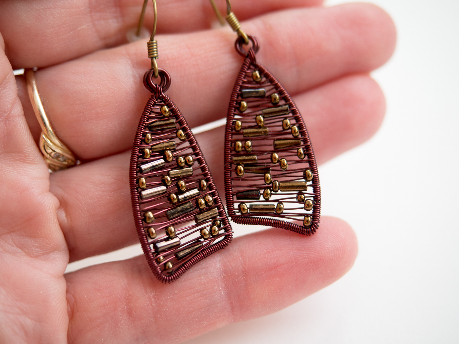 viseči rjavi uhani iz žice in perlic ‘jadro’