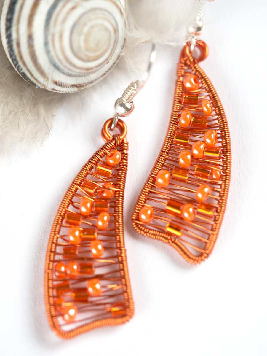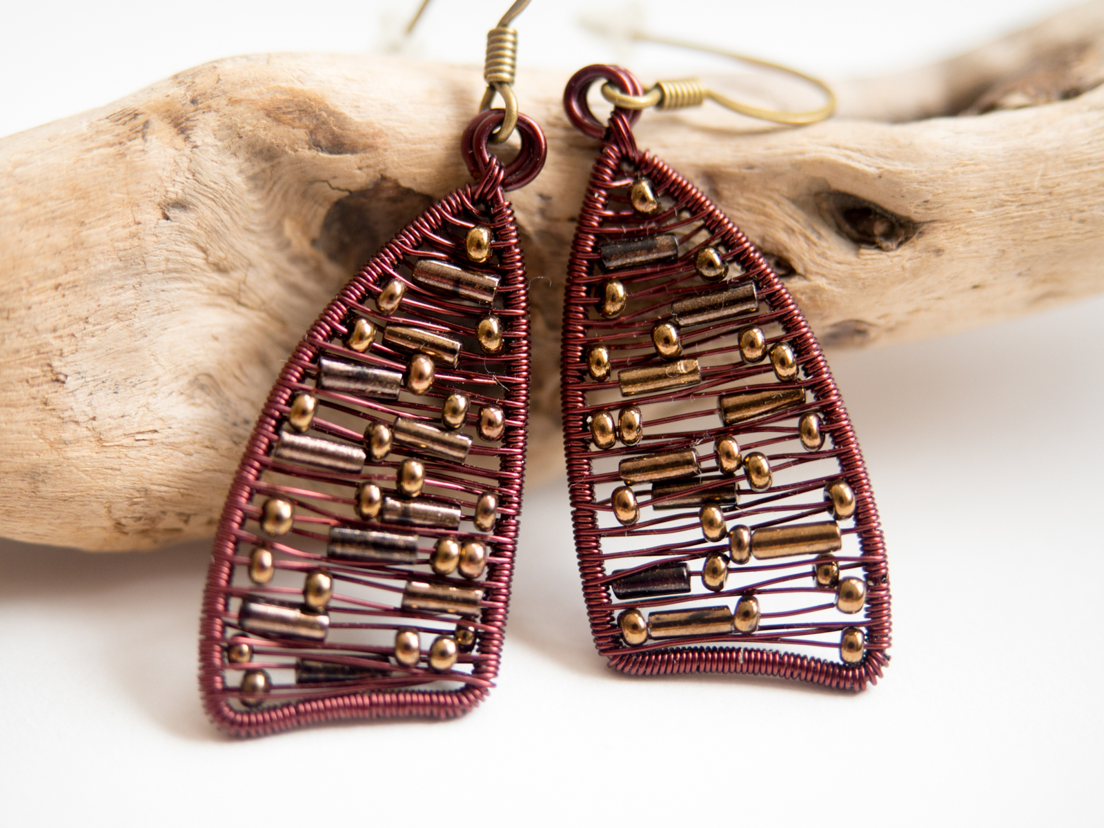 Rdeči in bakreni uhani iz žice in perlic – ‘listi’