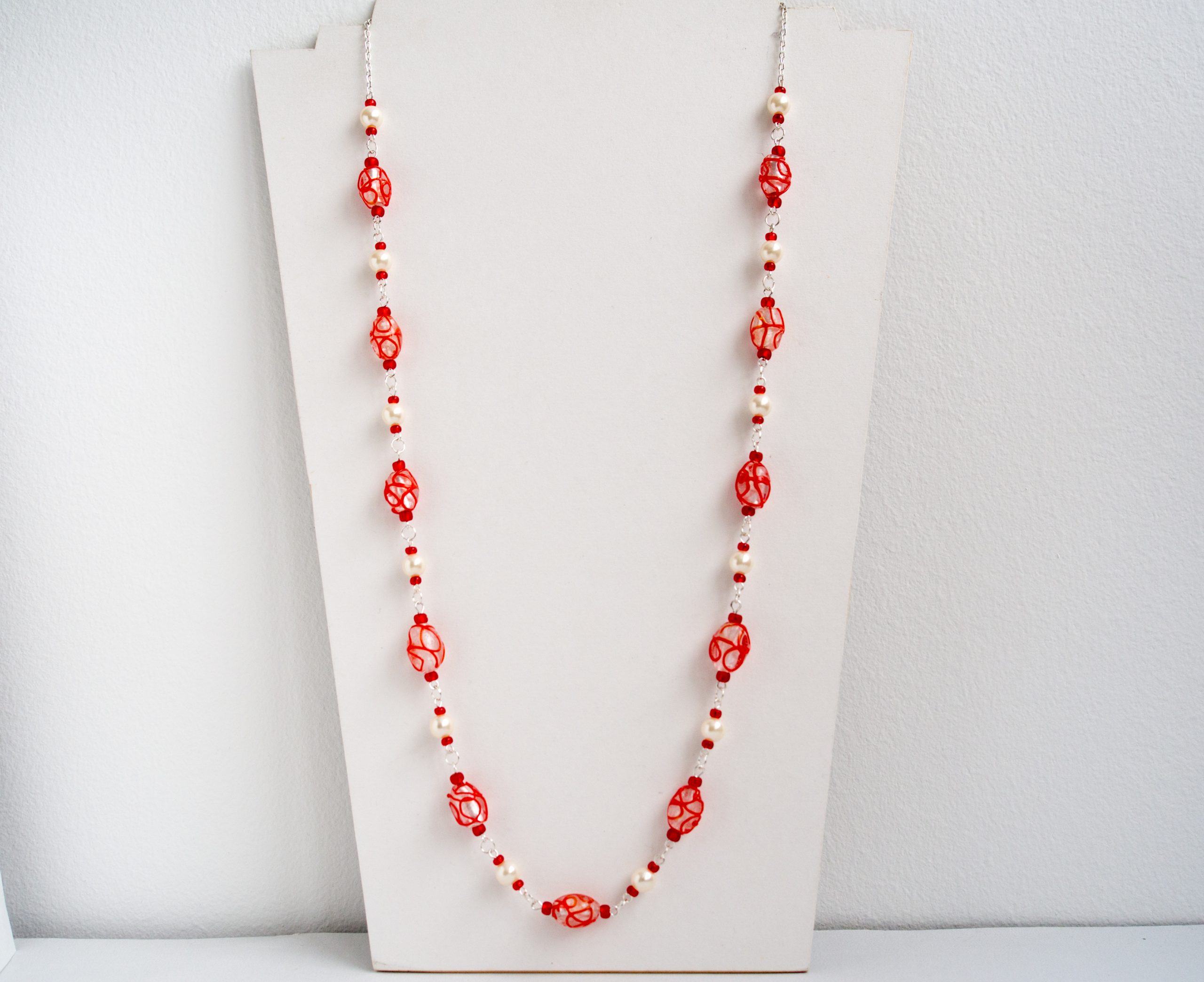 Rdeča ogrlica muranskega sloga z belimi perlami